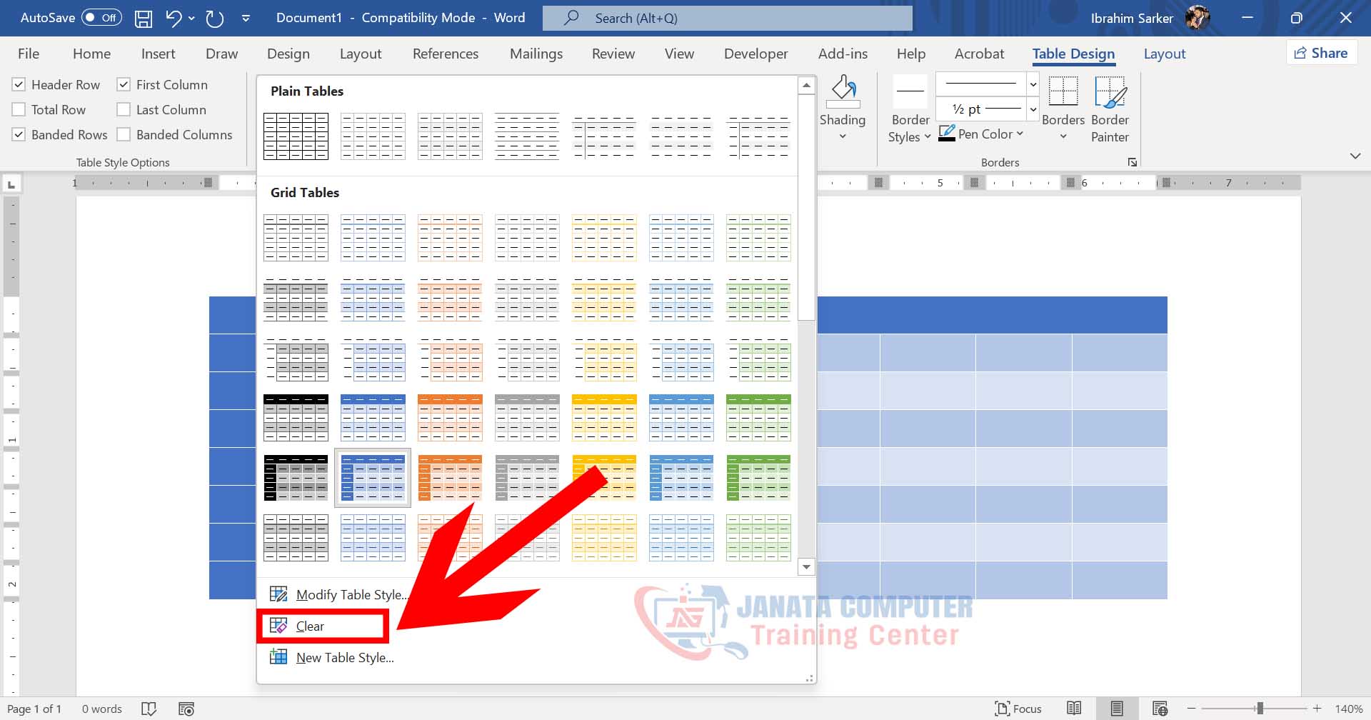 Table সিলেক্ট করুন। Table Styles থেকে একটি নতুন Style নির্বাচন করুন অথবা Clear অপশন ব্যবহার করুন।