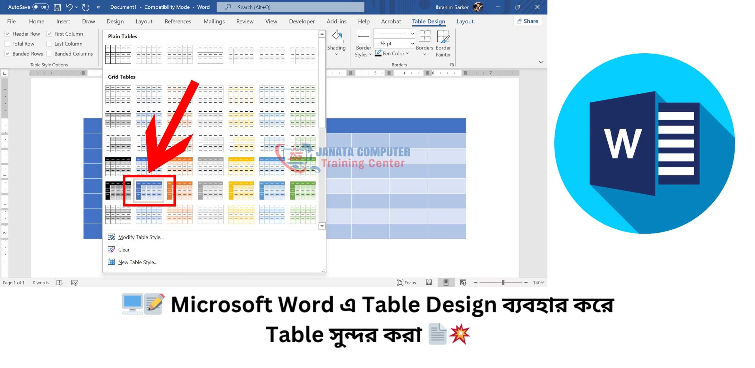 Microsoft Word-এ অনেকগুলো Built-in Table Styles দেওয়া থাকে, যেগুলো ব্যবহার করলে এক ক্লিকেই Table-এর ডিজাইন বদলে যায়। কিভাবে ব্যবহার করবেনঃ